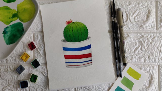 Learn how to paint a cute cactus in a pot using wet-on-wet techniques and add beautiful details using wet-on-dry.